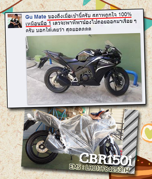 คุณ สัณฐิติ ซื้อรถ CBR150i และให้ส่งไปรษณีย์ไปจังหวัดเชียงใหม่ค่ะ
